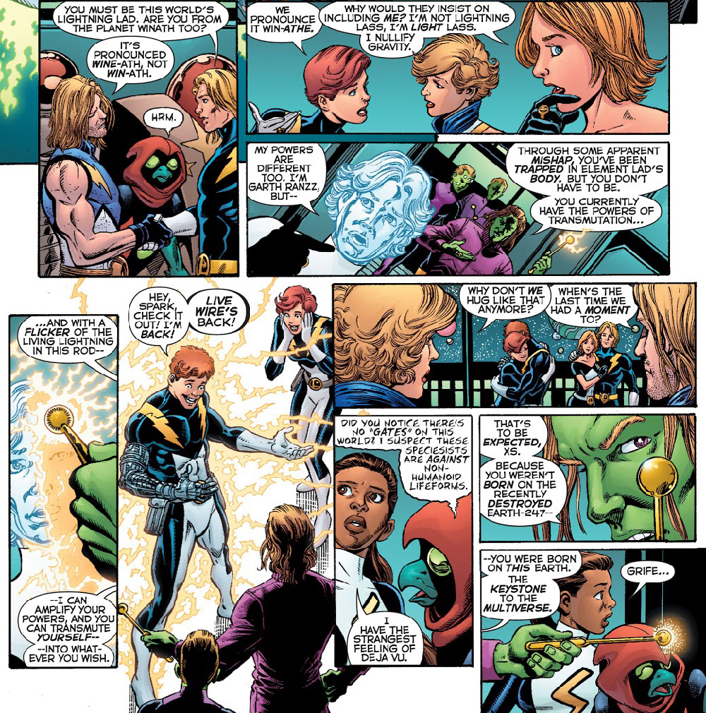 The Reboot Legion was called to fight alongside two other Legions from parallel universes. During their battle against Superboy-Prime and the Time Trapper, the Brainiac 5 of Earth-0 used his lightning rod to amplify Live Wire's original powers. This enabled him to transform himself back to his original, non-crystalline body. (Final Crisis: Legion of Three Worlds #4)