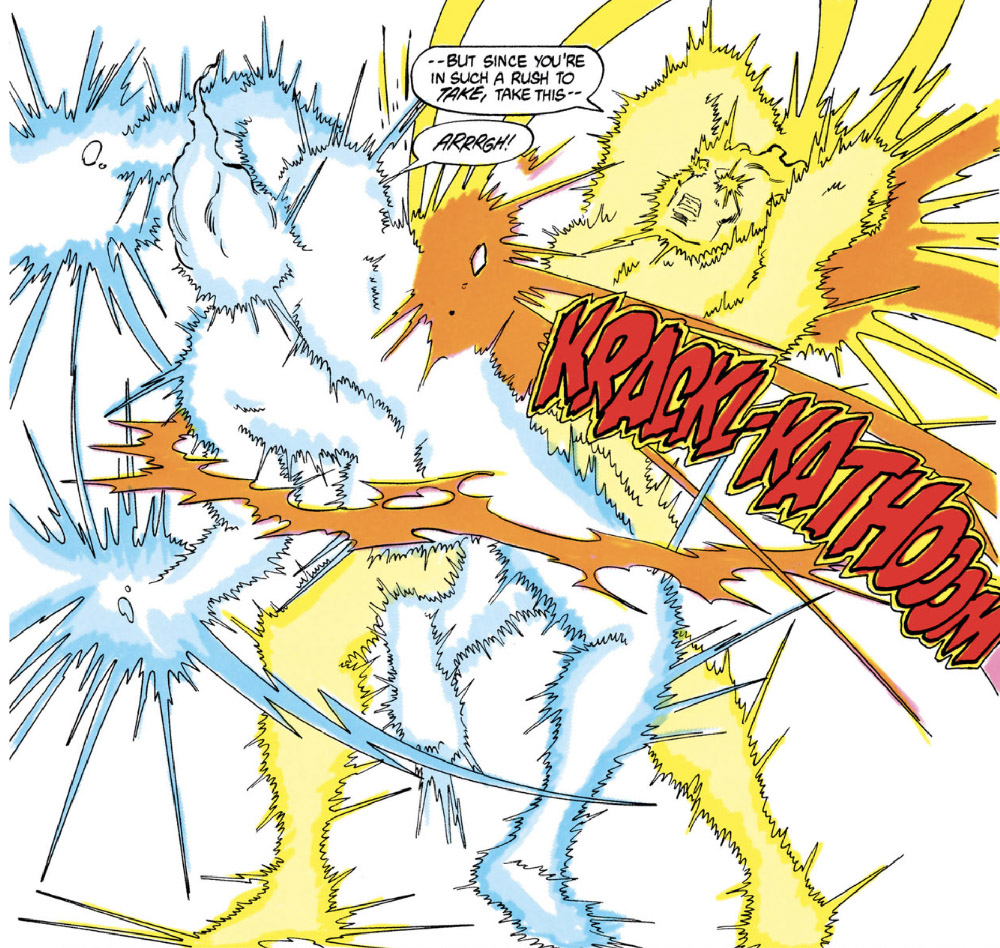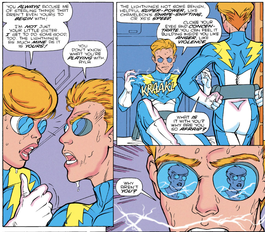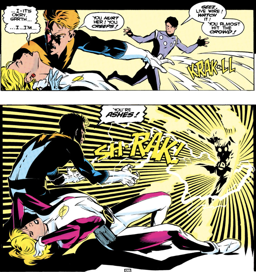 This time, his relationship with Saturn Girl was strained. She found his behavior immature, and they grew apart. His hotheadedness came to a head in Mexico, where the Legion was trying to quell food riots. Live Wire unleashed his power and accidentally fried Cosmic Boy. (Legionnaires #9)