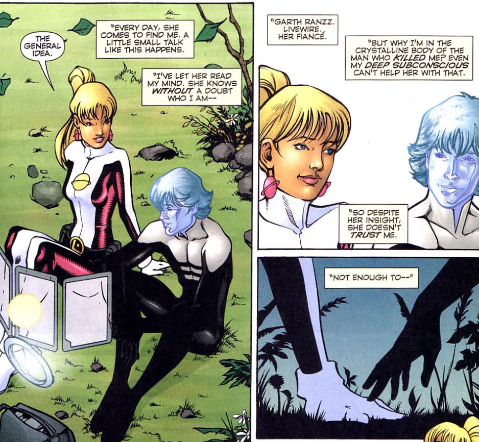 When the Blight attacked Earth, Live Wire and Saturn Girl were among ten Legionnaires aboard the Legion Outpost when it disappeared through a rift in space. In distant "Second Galaxy," Garth created a garden for food, while Imra slowly buckled under the burden of leadership. When she lost the team's trust, Live Wire assumed the role.