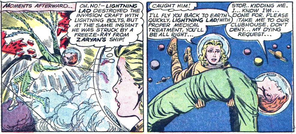 Lightning Lad was enamored of his fellow founder, Saturn Girl, but he didn't really show it. When Imra received a prediction that a Legionnaire would die battling the Khund called Zaryan, she took drastic measures to ensure it would be she who died. She rigged the Legion's first leader election so that she would win, and then suspended the other Legionnaires. Despite her efforts, Lightning Lad intervened; he died protecting Saturn Girl and Earth from the Khundish fleet. Garth was the first Legionnaire to die in the line of duty. (#304) NOTES: Garth's interest in Imra was not explored prior to this, though an "Adult Legion" story from Action Comics #289 (June 1962) suggested that they would one day marry.