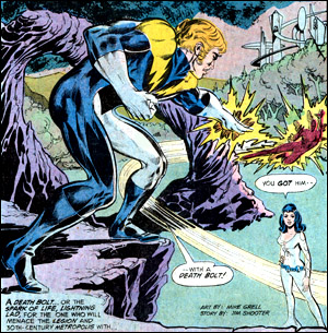 Jim Shooter on Lightning Lad: "One of the reasons for his sister's retiring personality. He is a showman, a proud, powerful exemplary hero. A confident, dominant man, man enough for the likes of Imra Ironass Ardeen. Certainly his revival from death has affected him. Doubtless he feels now that he has a great role to play—a mission. He is good. He knows it—he strives for it and will not be denied his place in the heroic limelight." —Interlac (1976)