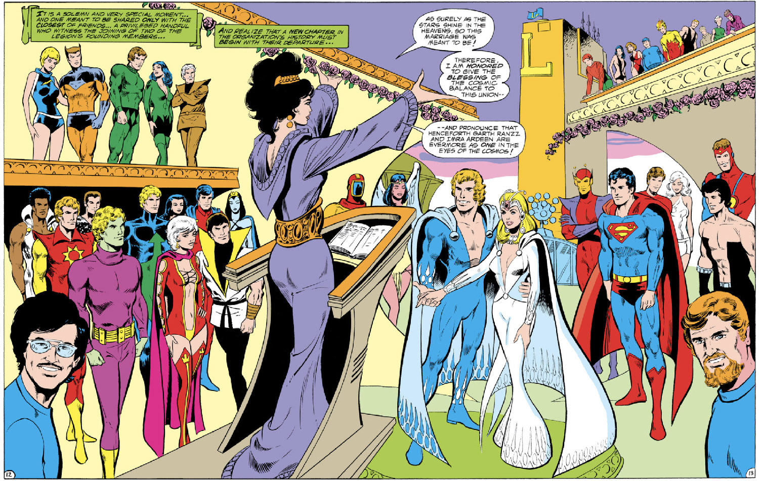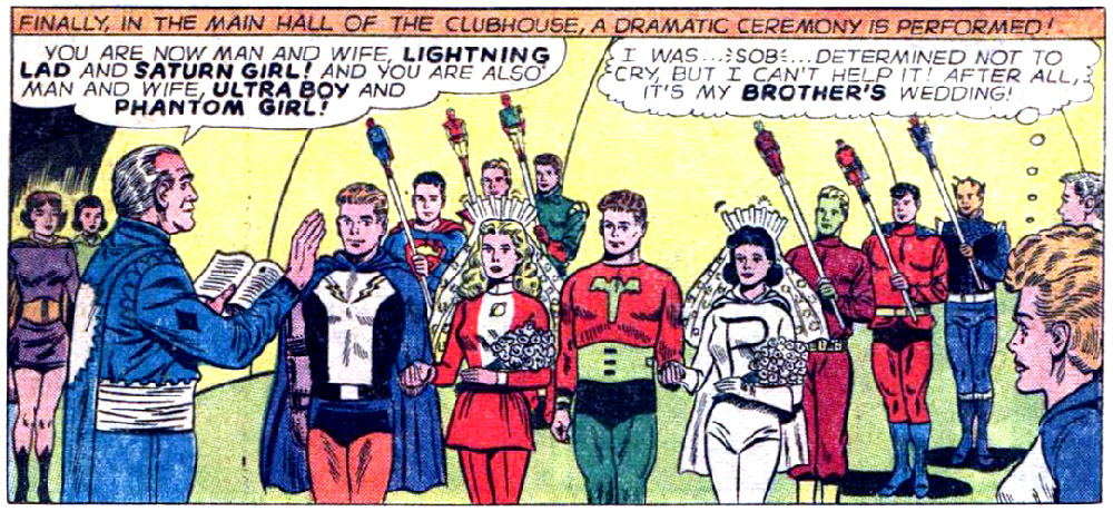 When Lightning Lad proposed to Saturn Girl for real, the two of them underwent a trail on her homeworld of Titan to determine their compatibility. (Superboy & the Legion #236) Theirs was the second Legion wedding (after Bouncing Boy and Duo Damsel), and true to super-hero tradition it was upset by the Time Trapper. The Legionnaires traveled back and forth through time to confront the Trapper and reverse his changes to their timeline. (Limited Collector's Ed. #C-55)