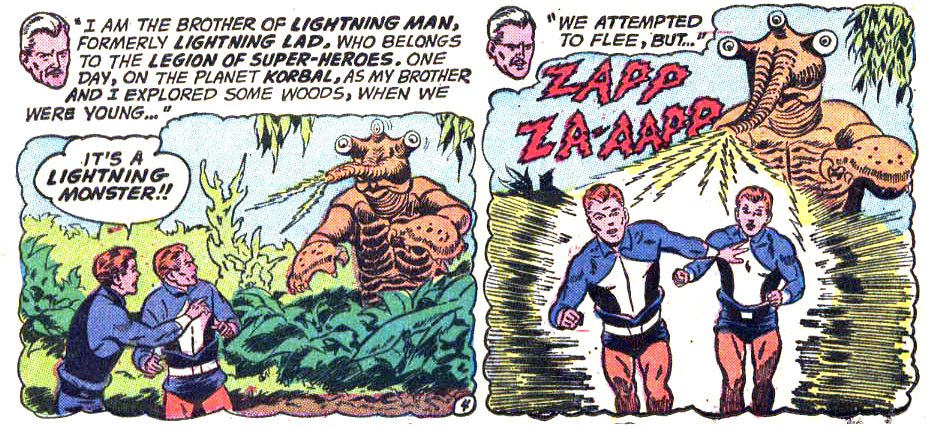 The Legion continued to search for a way to revive Garth. Their chosen method came with the price: the life of another. Several Legionnaires volunteered to return to Korbal, where they held special lightning rods to channel the electicity into Garth's preserved remains. Behind the scenes, the Legion's friend, Proty, had incapacitated and impersonated Saturn Girl. He was the one to ultimately pay the price — but it apparently worked! — Lightning Lad was restored to life while Proty perished. (#312)