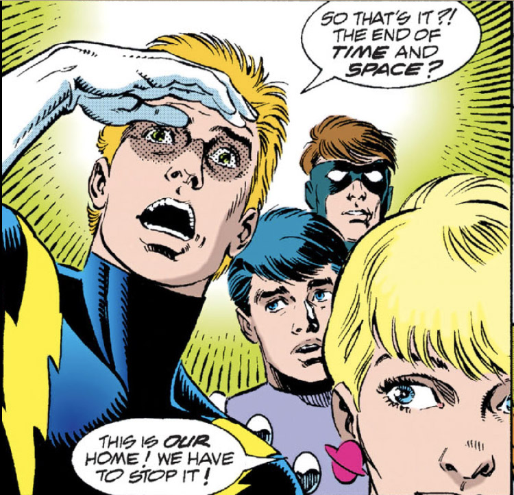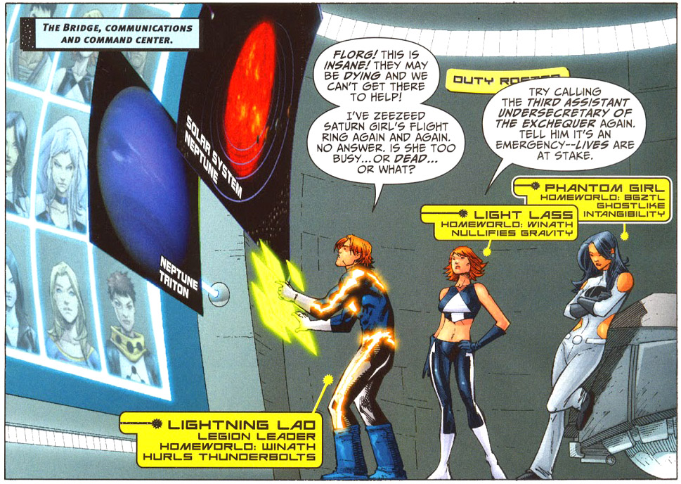 Live Wire, Cosmic Boy and Saturn Girl were part of a handful of Legionnaires selected by the Time Trapper to try to avert a "crisis in time." They fought alongside the 20th century's heroes during that "Zero Hour," but when they returned to the 30th century, it was all for nothing. (Zero Hour #3–1)