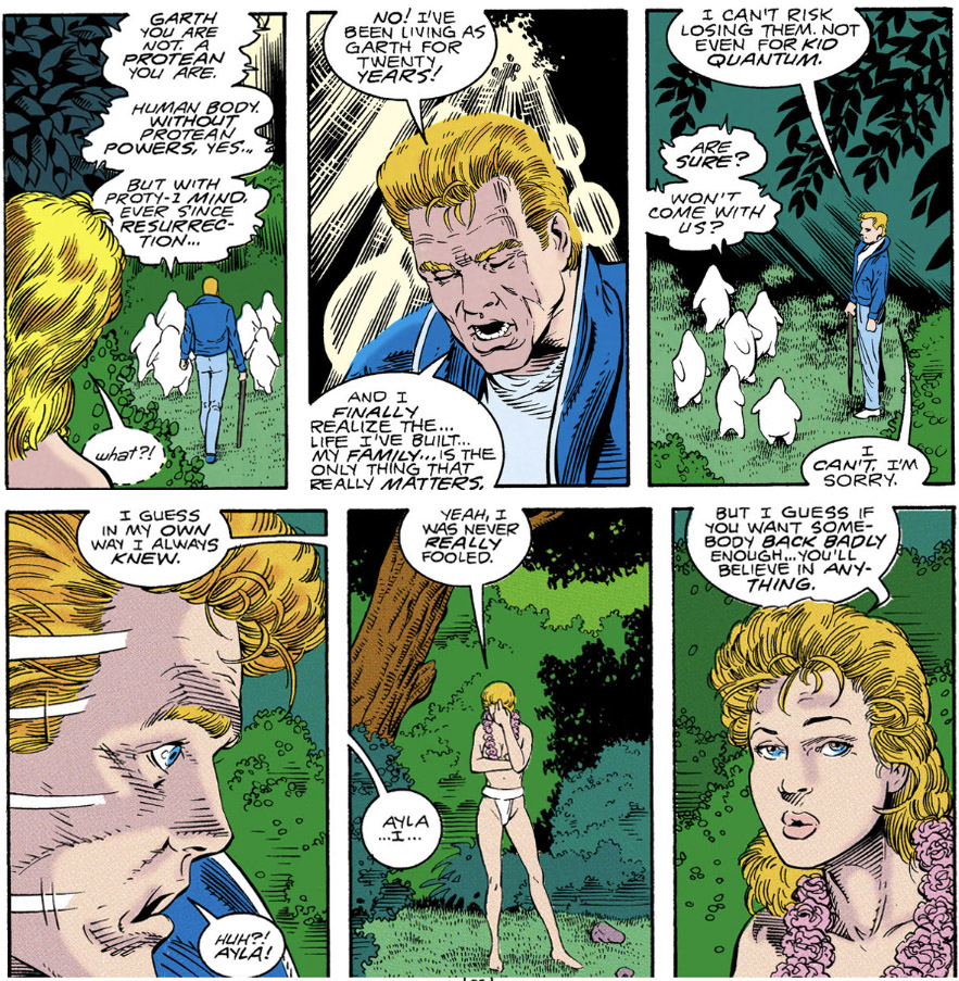 Tom & Mary Bierbaum on Lightning Lad: "The original Garth was a charismatic bad boy who nobody was quite able or willing to straighten out. He finally found real valor in himself when he sacrificed his life for Imra. When the team tried to resurrect him, they instead gave him Proty's personality, which was the heroic, dedicated and slightly unbalanced Garth we knew during most of the Legion's run." —Interlac (2000)