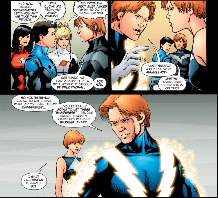 When Garth located his brother, he received a nasty shock. Gone was the Mekt he once idolized, now replaced by a ruthless criminal who called himself Lightning Lord. (Legion vol. 4 #73) Mekt was hell-bent on killing anyone with lightning powers so that he could be unique; it was a rebellion against the twin-centered culture on Winath. Garth finally saw Mekt for the sociopath he was, and defeated him with Ayla's help. In this battle, Garth lost his right arm. (Legionnaires #30) The arm was replaced by a mechanical prosthetic, which could not withstand the lightning energy he generated.