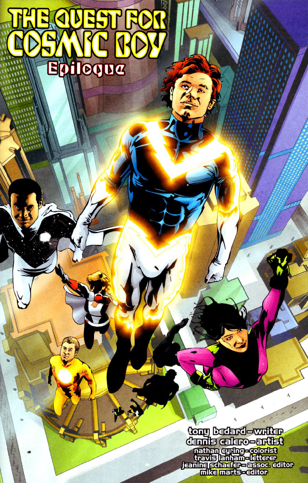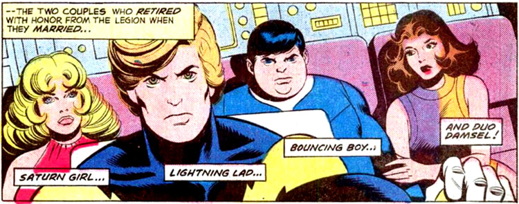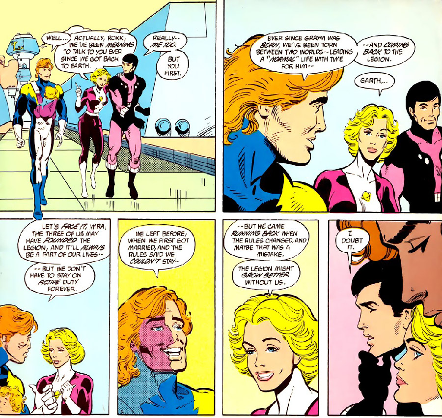 After this, Lightning Lad and Saturn Girl took a leave of absence (Legion vol. 6 #6) to settle their boys on Winath. (Legion vol. 7 #5) They returned to Earth for a happy night out with Cosmic Boy and Night Girl. (#8)