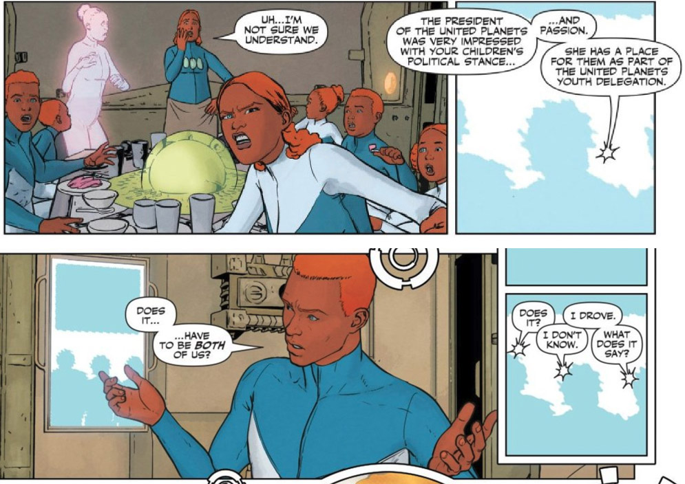 At home afterwards, the teens' two mothers and four siblings argued about the day's events. Their meal was interrupted by the United Planets' Science Command, who came bearing an invitation for the twins to join a U.P. youth delegation at the invitation of President R.J. Brande. Of the two, Ayla was the more vehement activist, and she refused. Garth (who had never left the city of his birth) traveled to Daxam to meet Brande.