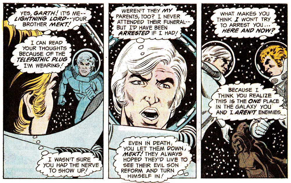 Garth's brother, Lightning Lord, reappeared several times. Each time the brothers fought violently but Garth sent Mekt back to prison. In one of their battles, Mekt's hair was turned white by the excess of electrical energy. (Superboy #172)