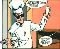 Tenzil Kem was working at a lunch counter when R. J. Brande, in the formative days of the United Planets, decided to take a low-key tour of the galaxy, that lunch counter being one of his stops. (Legion Secret Files #1) When Brande formed the Legion of Super-Heroes, he remembered Tenzil and hired him to be the Legion's resident cook, as he can create almost any dish known to the galaxy.