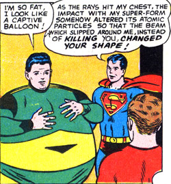 As time went by, however, Tenzil masked feelings of inadequacy about his powers. It didn't help that when the Legion was imprisoned in the Super-Stalag of Space, the villain Nardo nearly killed Matter-Eater Lad and altered his atomic structure, making him super-fat. (Adventure #345) (He was later cured of this condition by Doctor Zan Orbal).