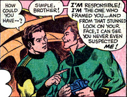 Despite his bizarre ability, his self-confidence enabled Tenzil to gain acceptance as a Legionnaire on his first try. In his first case, he was accused of betraying the Legion to the alien spy-master Meglaro. He was cleared when Brainiac 5 revealed the real Legion infiltrator — a miniaturized spy implanted in Lightning Lad's leg by Dr. Landro, one of Meglaro's accomplices. (Adventure #303)