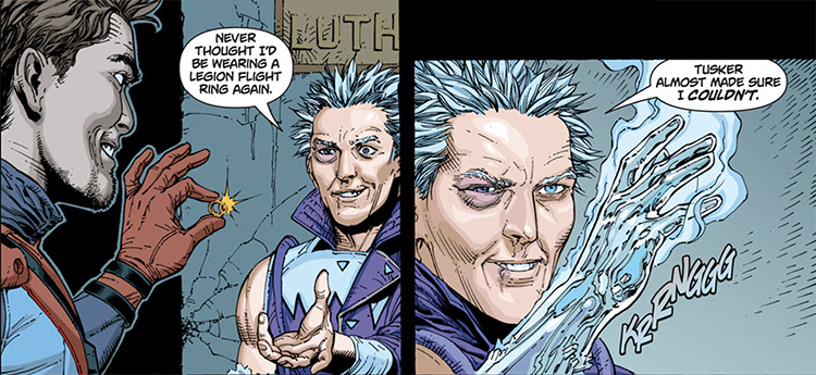 Earth Man and his "Justice League" (an evil team of Legion rejects) took over Earth. Brek was captured by the League. He was held under extreme heat, tortured, and lost an arm. This horror did not deter him from his duty as a Legionnaire. When he was rescued by Superman and others, he chose simply to manifest a new arm made of ice in order to wear his Legion flight ring again. (Action Comics #860)