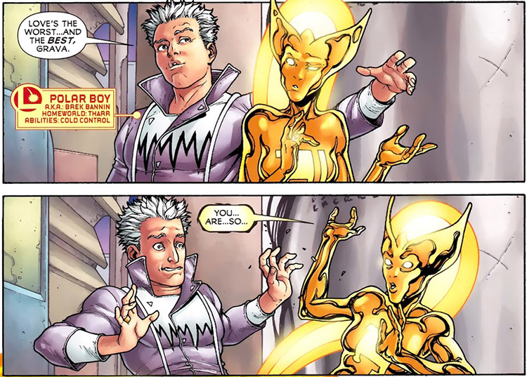 For the first time, Polar Boy demonstrated romantic interest... in fellow Legionnaire Comet Queen. She strongly rebuffed him at first but (Legion vol. 7 #2) but later she enthusiastically joined him for a night on the town. (#5)