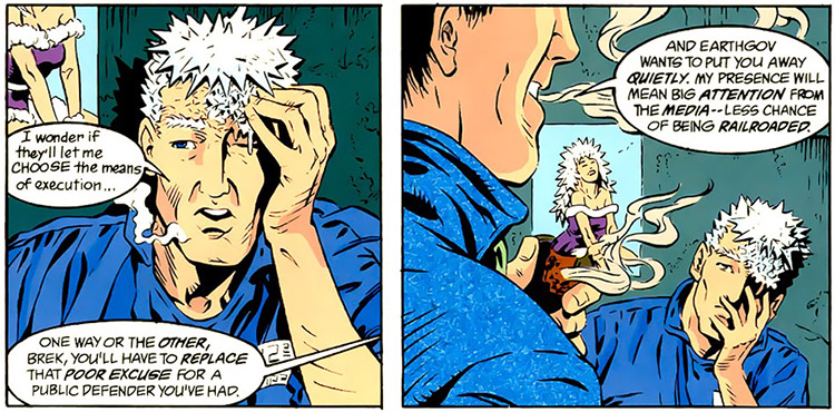 Brek continued his campaign against Earthgov tyranny and led a protest against injustice, for which he was imprisoned for two years. At his trial, he was represented by Tenzil Kem of Bismoll (the former Matter-Eater Lad). Kem created a media circus and generated galactic sentiment to win Bannin's freedom. (Legion vol. 4 #10-11)