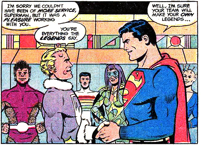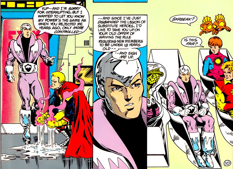 Formerly Polar Boy, Polar Man was shown as a member in the Adult Legion story from Adventure #354 (Mar. 1967). Of course, this "prophesy" came true — nearly 20 years later — when Polar Boy finally earned his membership (although he never took the "adult" name). (Legion vol. 3 #14)