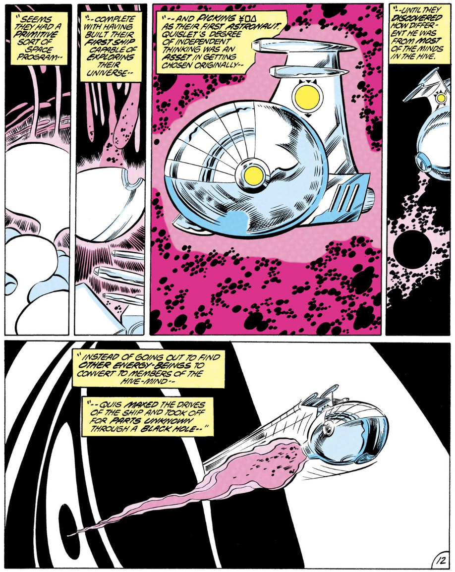 Quislet is a member of a nongendered race of energy beings in a dimension called Teall. Quislet was atypical in that it exhibited independent thought, and felt that its culture was oppressive. When their technology advanced far enough to create a matter-based exploration vehicle, Quislet was chosen as their first "astronaut.” Quislet's mission was to discover beings that could be converted to their group mind. Quislet journeyed throught a black hole to Earth, where it began life as an “explorer.”