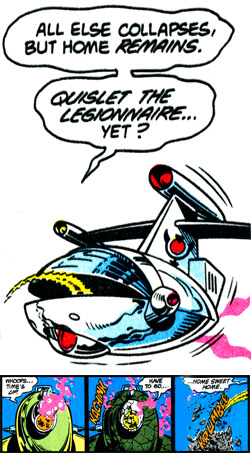 After his departure, Sun Boy filed an incident report saying, “The loss of Quislet doesn’t fall into the category of a resignation or a death. With the destruction of its little ship by the Emerald Empress, Quislet was forced to return to its own dimension. Apparently the ship gave it more than just transportation. The ship was what actually allowed Quislet to stay here.” (2995: The Legion Sourcebook)