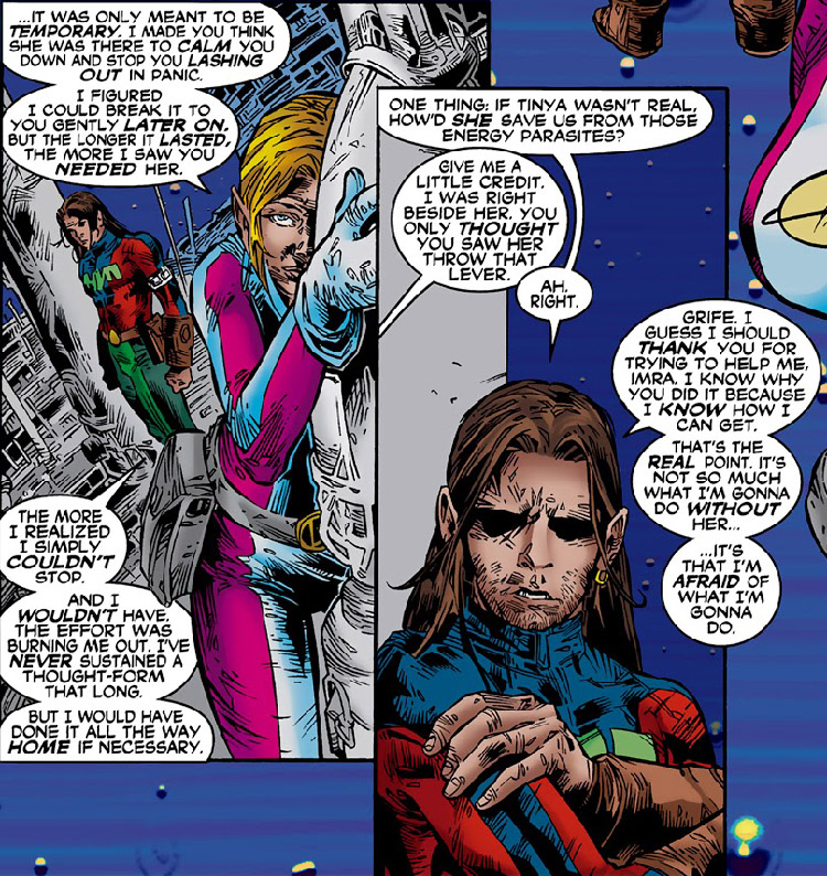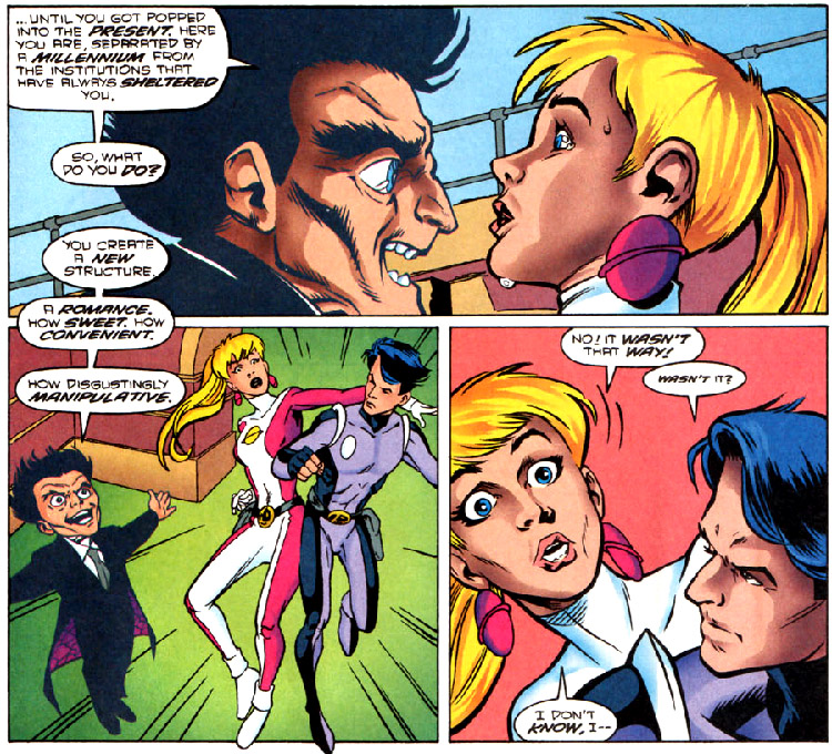 The Saturn Girl of "Batch SW6" was still young in her relationship with Lightning Lad (now going by "Live Wire"). Imra was somewhat insecure about their love and even chafed against Garth's behavior at times (this Garth did not have the personality of Proty). They even broke up! (Legionnaires #12)