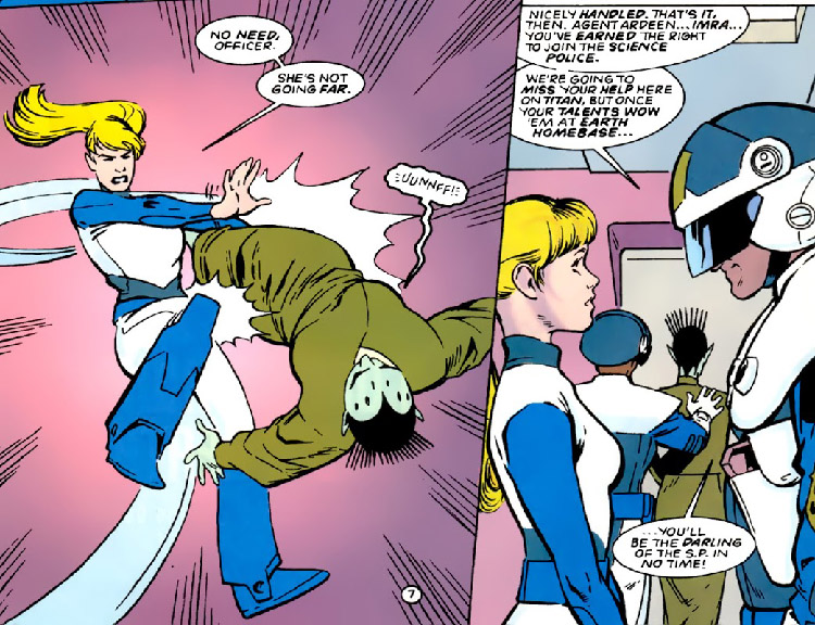 Saturn Girl showed leadership potential of her own, taking a team to Rimbor after alien destroyers. (#42)