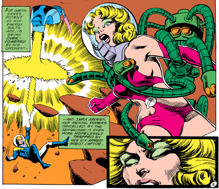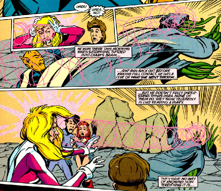 Imra was invaluable to the team, but on multiple occasions her high power levels combined with her heightened sensitivity led her to make less-than-ethical decisions. When she entered the mind of her teammate, Chameleon, his Durlan mind overwhelmed her abilities and she found began to question herself. She overcompensated by shutting down the mind of the evil Composite Man, an act which drove her mad. (#69)