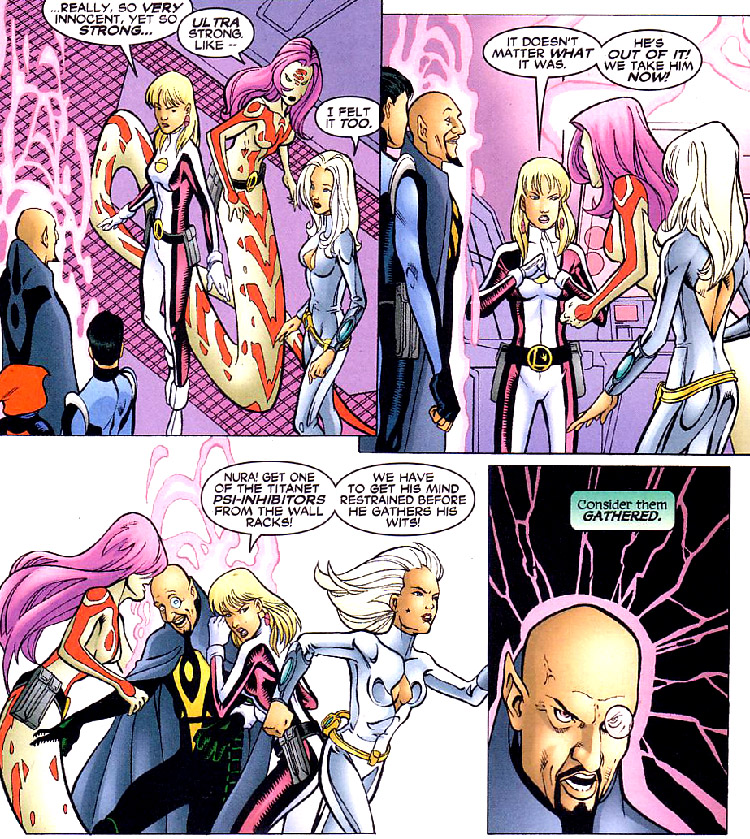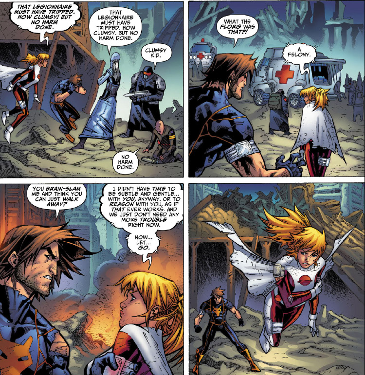 En route, she met Garth Ranzz and Rokk Krinn. Brande called the three together for their power, counsel and perspective amid growing discontent in the U.P. When Brande was attacked by the alien Horraz, Imra and the others leapt to her defense. (Legion vol. 8 #4)