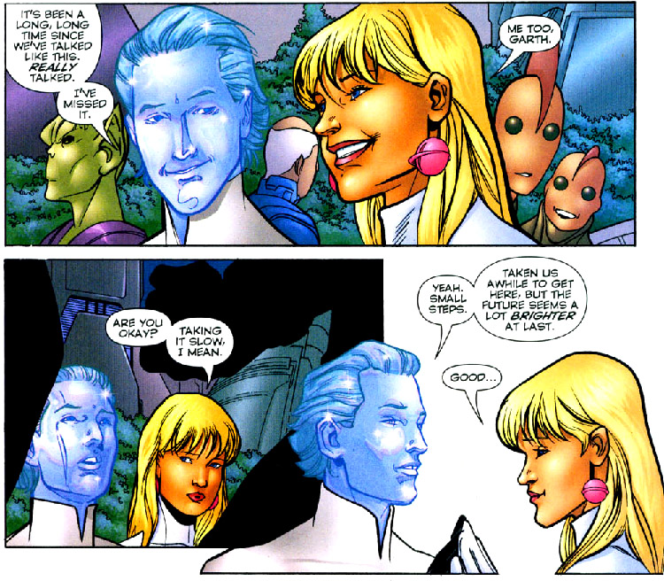 The team was shocked when Live Wire reappeared, alive — his mind had imprinted on the former crystalline body of Element Lad! (#25) Imra had trouble reconciling her feelings for Garth while he was in this form. They eventually reunited but agreed to take things slowly. (#33)