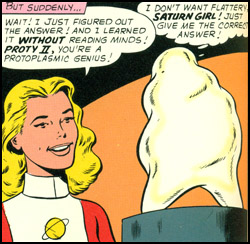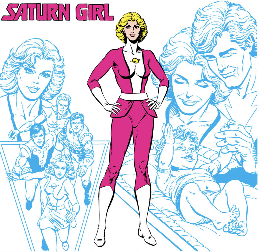 Jim Shooter on Saturn Girl: "An organizer, a businessman-like, clever, smart competent women's libber who scared away every guy she met until Lightning Lad with his overwhelming ego treated her like a lady, and she loved it. She is a wild, wild woman in bed, who undoubtedly has occasionally accompanied Lightning Lad on his forays into Dream Girl's boudoir." —Interlac (1976)