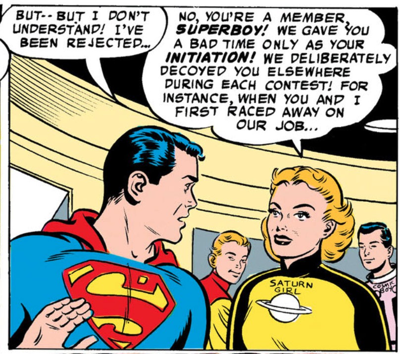 Saturn Girl was a prominent member from the start, on hand for almost every mission. She participated in the Legion's trips to the 20th century where they recruited both Superboy (Adventure Comics #247) and Supergirl (Action Comics #276) to join the team in the 30th. Note: In Saturn Girl's first appearance, Adventure #247, the three founding Legionnaires wore costumes that were never used again. The Legion's origin story was not told Superboy vol. 1 #147 (May/June 1968).