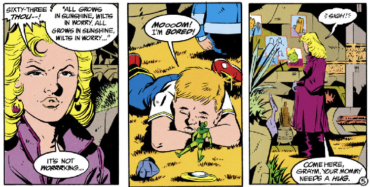 Imra and Garth were the foundation of the Legion, but after his own stressful term as Legion leader, Garth's health and sanity began to fail him. (Legion vol. 2 #290) Saturn Girl nursed him back to health and soon the they were pregnant with the Legion's first babies. (#307) Initial tests indicated that Imra would bear twins, the genetic default among Garth's people on Winath. But the birth was marred by a sinister darkness created by the villain Darkseid, Imra bore only one child, Graym. The couple thought nothing of it, assuming it must have been an error in the tests. (Tales of the Legion Annual #3)