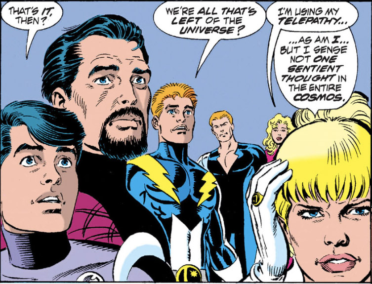 She handed over the reins of leadership to Live Wire (#9) — who died at the end of this mission. Saturn Girl helped him as much as she could, using her powers to enter the mind of the omnipotent Progenitor (the former Legionnaire Element Lad). (#12)