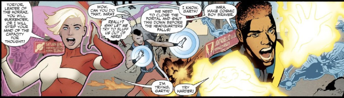 But when the new Fatal Five launched a galactic offensive, Saturn Girl and Lightning Lad returned to help. (#21) Tharok takes Saturn Girl and Lightning Lad to the Promethean Giant. Saturn Girl puts down the Empress and Sensor Girl manages to "awaken" the Giant. It defies Tharok, who is then frozen by Polar Boy. (#22)