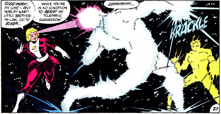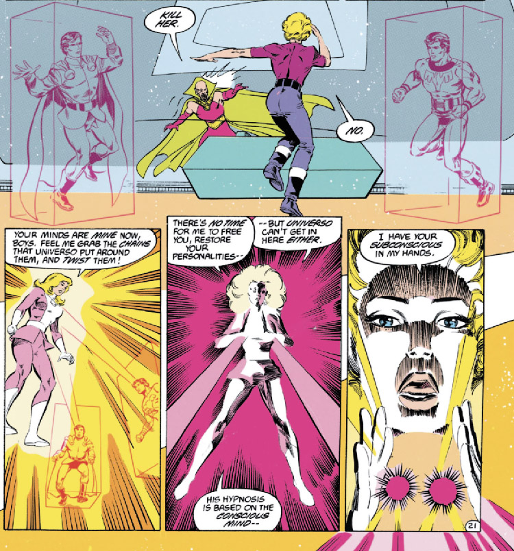 When Universo took control of the Earth in early 2987 and hypnotized and imprisoned many heroes, including her, her powerful mind broke free on its own, and enabled her to free the others. It was she who finally broke Universo's hold over Earth and forced him unconscious. It was then that she realized how much the Legion was in her blood, and she rejoined — this time without Garth, who enjoyed his life as a father and househusband. (#32-35)