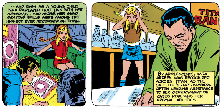 The Legion might never have been founded without Imra Ardeen. She was born on Titan, a moon of Saturn, and named in honor of one of her aunts. (Legionnaires 3 #2) On Titan all people possess telepathic abilities, but her family was known to be exceptionally strong and young Imra excelled early. She became Titan's top telepath and found herself participating in her world's peacekeeping forces. This led her to enroll in the Science Police Academy; she set out for Earth. (Superboy vol. 1 #147, Secrets of the Legion of Super-Heroes #1) Notes: Saturn Girl's real name was revealed name and homeworld were revealed in Superman Annual #4 (1961). Her parents first appeared in Adventure #356 (May 1967), but their names were never revealed.