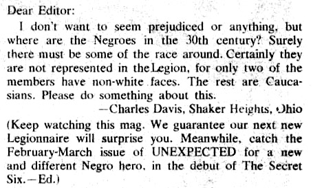 One anecdote suggests that the character of Shadow Lass might have been intended to be a Black heroine. In Adventure Comics #363 (Dec. 1967) a letter writer asked why black people were not represented among the Legionnaires. Mort Weisinger responded, “Keep watching this mag. We guarantee our next new Legionnaire will surprise you.” Two issues later, Shadow Lass was introduced — but with blue skin.