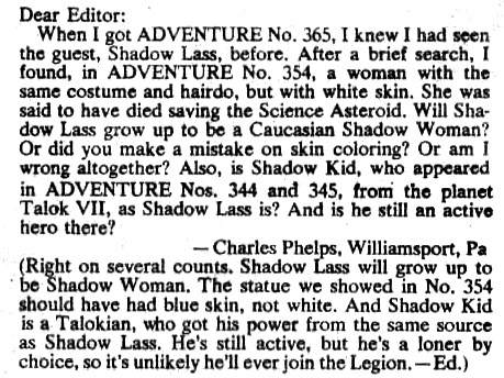 Yet another reader asked about the difference in skin coloring in the letters column of Adventure Comics #368 (May 1968): "Will Shadow Lass grow up to be a Caucasian Shadow Woman?” Weisinger replied, “Shadow Lass will grow up to be Shadow Woman. The statue we showed in No. 354 should have had blue skin, not white.”
