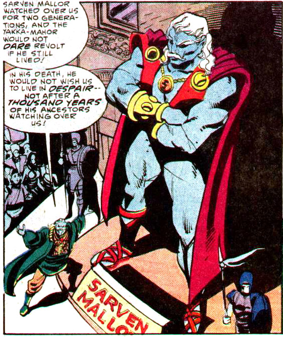 On Talok VII, people become desperate to find the descendants of their planetary protector, Sarven Mallor (Tasmia's grandfather). From Secret Origins #8 (1986); art by Tom Mandrake.Tasmia and Grev Mallor meet the sprits of their ancestors in a sacred cave on Talok VIII. From Secret Origins #8 (1986); art by Tom Mandrake.Shadow Lass steps up.