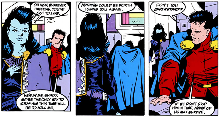 Tasmia comes to grips with the return of her presumed-dead spouse. From Legion of Super-Heroes vol. 4 #4 (1990); art by Keith Giffen and.
