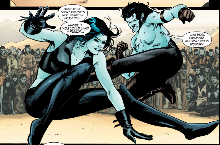 She comes from a race of warriors and likes to get physical. She appears