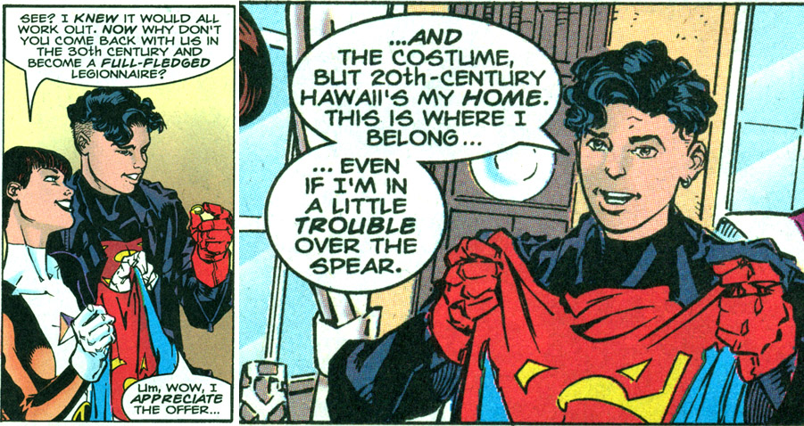 Later, a group of Legionnaires were stranded in the twentieth century, and to their dismay discovered that Superboy had given his Legion flight ring to his best friend Roxy Leech. They revoked his membership for this perceived offense. (Legion vol. 4 #94) He was soon re-entrusted with the flight ring, and warned not to give it away again. At this time they also gave him an official Legion costume (which he never wore). (Superboy #45) Shortly before they returned home, the Legion later summoned him to help them fight C.O.M.P.U.T.O. (Legion #99)