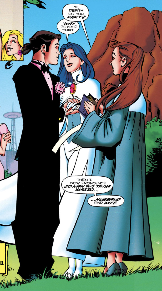 He discovered that somehow, Tinya had survived, ghostlike, inside of Jo. (Legion vol. 4 #82) She and Ultra Boy were among the Legionnaires who were cast into the 20th century by Shrinking Violet, by the power of the Emerald Eye of Ekron. (Legion vol. 4 #84) Ultra Boy proposed to Tinya then, and they were married. (#96)