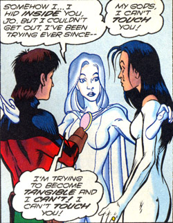The two teams were forced to partner on a mission to Planet Hell, where Ultra Boy became further attracted to Apparition. (Legionnaires #21-22, Legion vol. 4 #65) They exchanged gifts and began dating, despite the fact that he continued to work for McCauley, whom she considered morally reprehensible. In the fight against the White Triangle, Jo and Tinya declared their love for one another — this just before Apparition died in Jo's arms. (Legionnaires Annual #2)