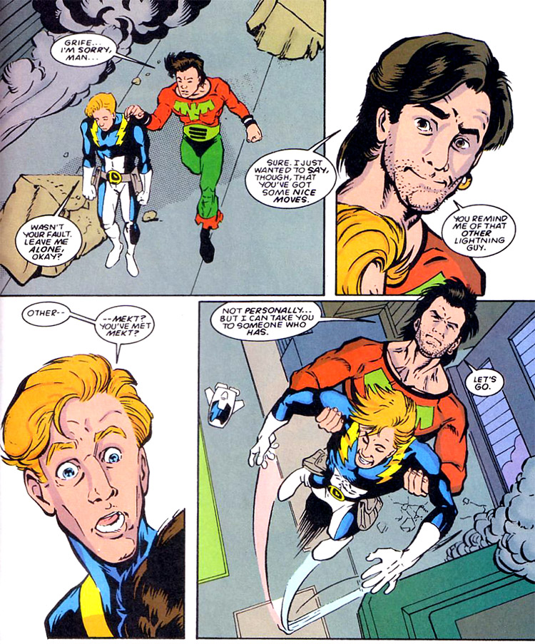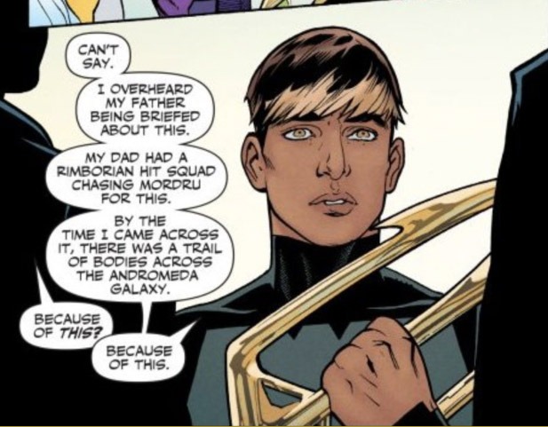 Ultra Boy returned home to Rimbor when he was summoned by his former girlfriend, An Ryd, who had partnered with a masked cohort. She double-crossed Jo and blasted him into unconsciousness. The masked man then killed An and took Ultra Boy's flight ring, framing him for the murder. By the time the Legion located Jo, he had been officially implicated in An Ryd's death (Marla Lathtam even returned from his retirement as Legion advisor to help the investigation). Ultra Boy escaped but was followed back to Rimbor by Chameleon Boy, who conducted a thorough investigation. Cham uncovered the fact that Wildfire had been replaced by a robot and it was the perpetrator of the murder. This left a crucial and unresolved question: who controlled the robot and killed An Ryd — and why? (Superboy & the Legion #239)