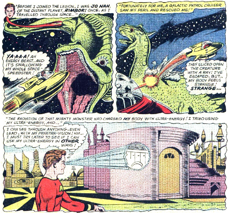 When Space Dragons gathered near Rimbor, thrill-seeking Rimborians would take a spacecraft to "play" among them. When one of Jo's friends set out to engage a dragon, Jo tried to stop him. He ended up being swallowed by the beast, which was actually an Ultra-Energy Beast. Jo was not killed; instead he absorbed some of its energy and soon found that he was able to focus the ultra-energy in various ways. He had penetra-vision and flash vision, super-strength, super-speed and an invulnerable force-field. He could only channel his energy into one of these abilities at a time.
