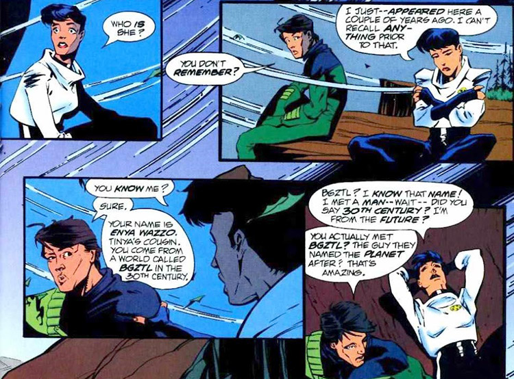 Valor suggested to Jo that Tinya might be in the 20th century. (#59) But when he finally made his way into the past, he discovered that Phase was Enya Wazzo, Tinya's cousin who was also on the ship the day Tinya died. (L.E.G.I.O.N. #68-70)