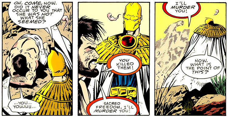 It took him some time to realize he was in the past (#15), and he found a way to get back to Earth. (#18) He landed there in Egypt, where Jo was manipulated into falling in love with a Lord of Chaos who had taken human form. He was monitored for months by Nabu the Wise (the power behind Doctor Fate), who ultimately sent the time-lost Legionnaire back to 30th century Winath (the point from which Jo had originally disappeared). It had been an emotional journey for him as well and he went to visit Tinya's grave where he allowed himself to mourn for her fully. (#19)