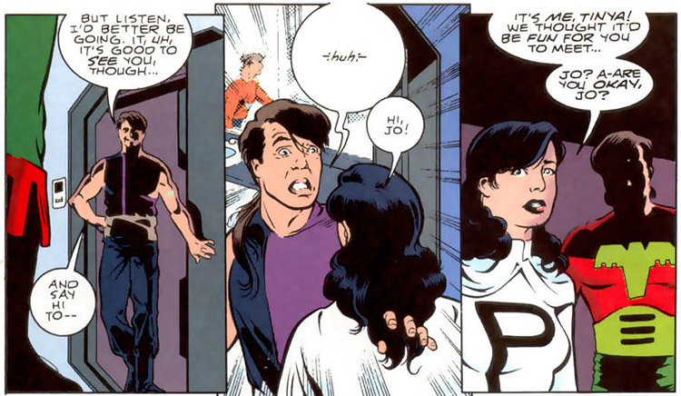 Jo returned to the 30th century just as reality was disintegrating from the time distortions of "Zero Hour." The remaining Legionnaires decided to sacrifice themselves by using the power of the Time Trapper to merge with their younger/SW6 selves and (hopefully) seed a new reality. In these final moments, the Trapper retrieved Tinya from just before her death. Jo and Tinya were reunited for only moments before their entire reality was wiped away. (Legion vol. 4 #60-61)