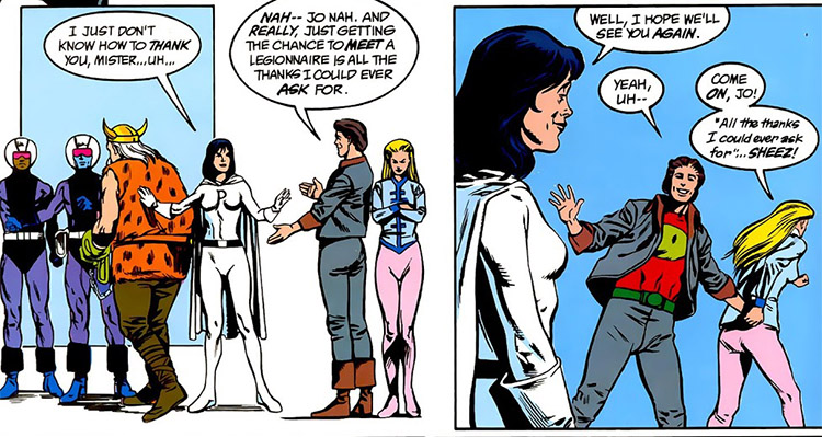 Ultra Boy severed ties with McCauley and wanted to join the Legion of Super-Heroes. But after this battle, Earth's President Chu declared a moratorium on new members. (Legion vol. 4 #72) Despite this Jo stuck around to help the team. He helped rescue Valor from the Stasis Zone. (Legionnaires #31)
