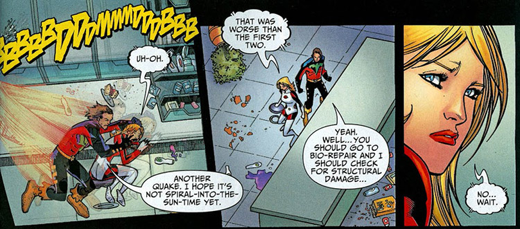 Before she and the Legion could reach him, though, he was blasted by Frake, and vanished again. Saturn Girl kept this secret from Phantom Girl. (#275)