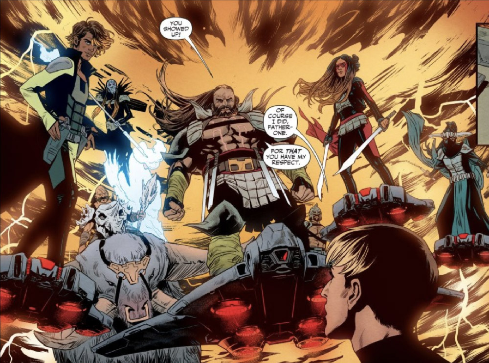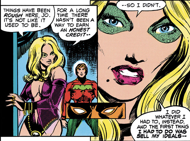 Former Legionnaires Reep Daggle (Chameleon Boy) and Rokk Krinn (Cosmic Boy) asked Jo to help rescue their teammate, Mysa Nal (the White Witch) from Mordru. (#3–7) This battle led to the official reformation of the Legion, but Jo was hurtled far back in time by a bomb set off by Roxxas the Butcher. Jo was sent into the distant past, on the Dominion-occupied planet of Khundia. (#11, 13)